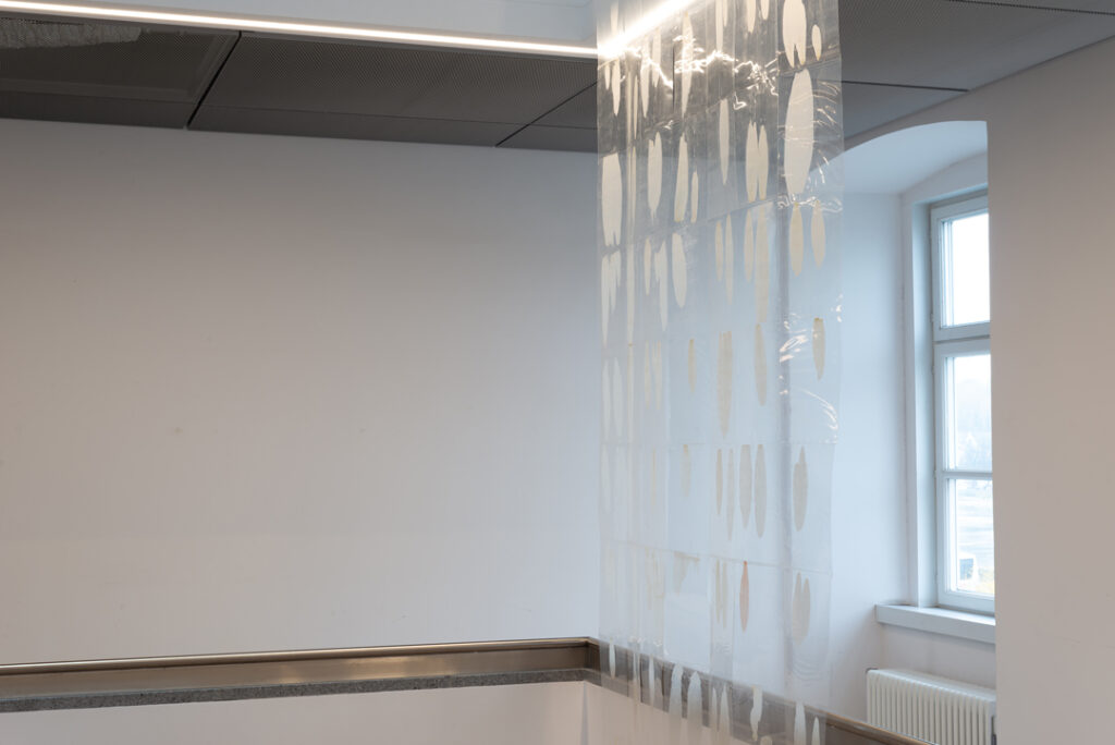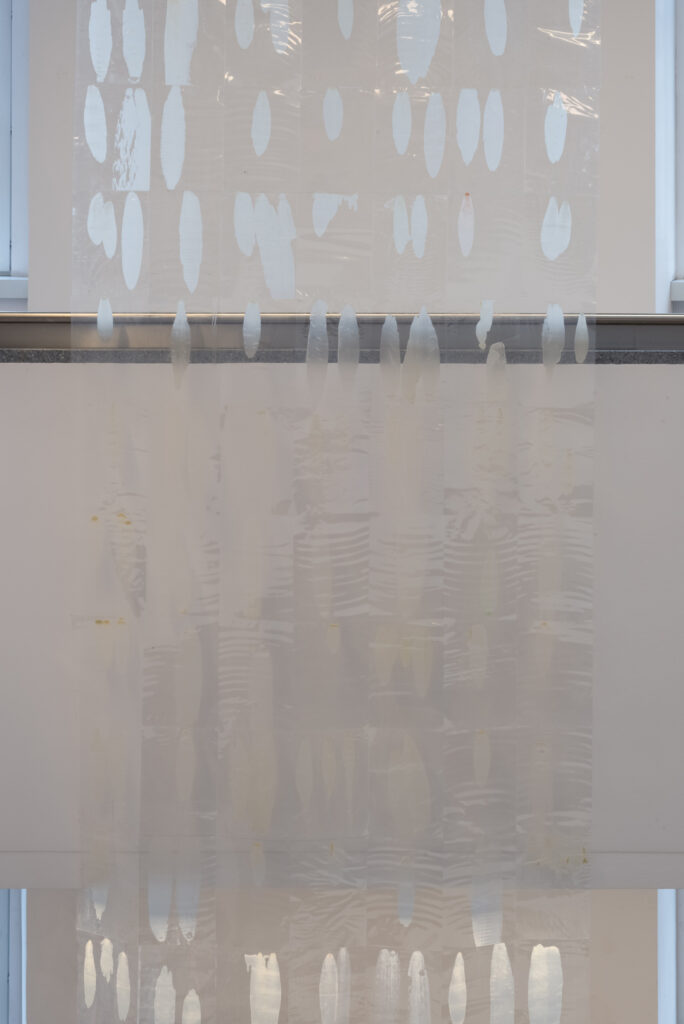 Defined as a routine of behavior that is repeated regularly and tends to occur subconsciously, Jana Ehls puts the ‘habit’ into focus. Consisting of more than 200 laminating foils, the large-scale installation ‘a habit a day (426)’ forms a calendrical surface that expands by one foil every day. Each of these foils preserves the gums that were chewed on the corresponding day. Therefore, the ongoing work opens up between Jana Ehls’ past as a dentist and a present analysis of mundane patterns of behavior.