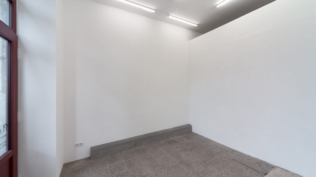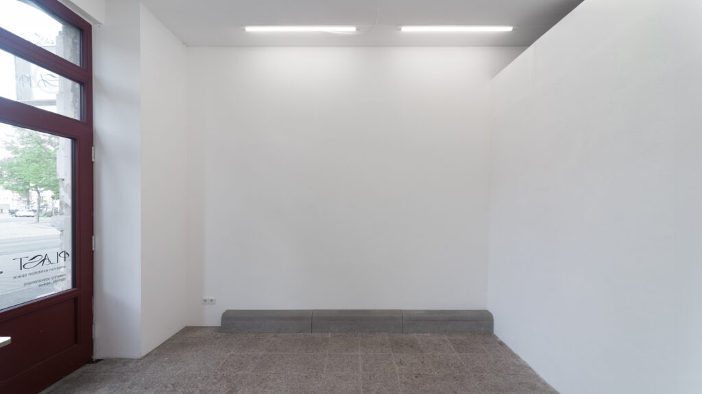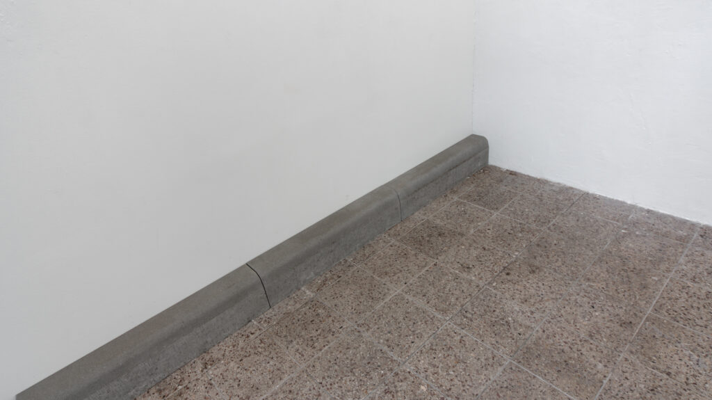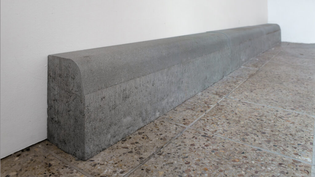 DIN 18040 nimmt Bezug auf die Bauordnung zu barrierefreiem Bauen in öffentlichen Räumen, die sowohl Gehwege als auch Lobbys inkludiert. Durch die Setzung von Bordsteinen am Rand des Ausstellungsraumes wird die Grenze zwischen Bereichen markiert, Gehweg und Fahrbahn, Wand und Boden, die für spezifische Nutzen und Personengruppen definiert sind. Als geplanter Eingriff in den (halb-)öffentlichen Raum leiten sie Besucher:innen an, diese Verbindungs- und Übergangsräume zu passiere und zu verweilen. Sie bieten Schutz vor Regen, markieren Grenzen, können Barriere sein, sich absenken, öffnen und Zugang ermöglichen oder verweigern.